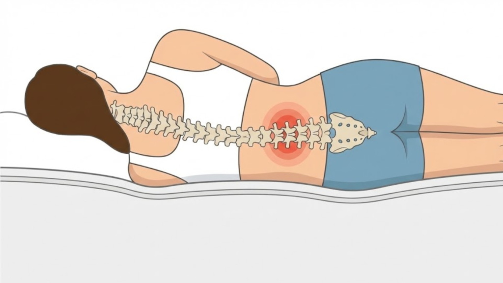 上記の図のように、この姿勢は腰回りの筋肉を常に引き伸ばし、緊張させているため、目覚めたときに強い張りや痛みを感じる原因となります。